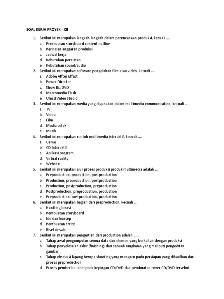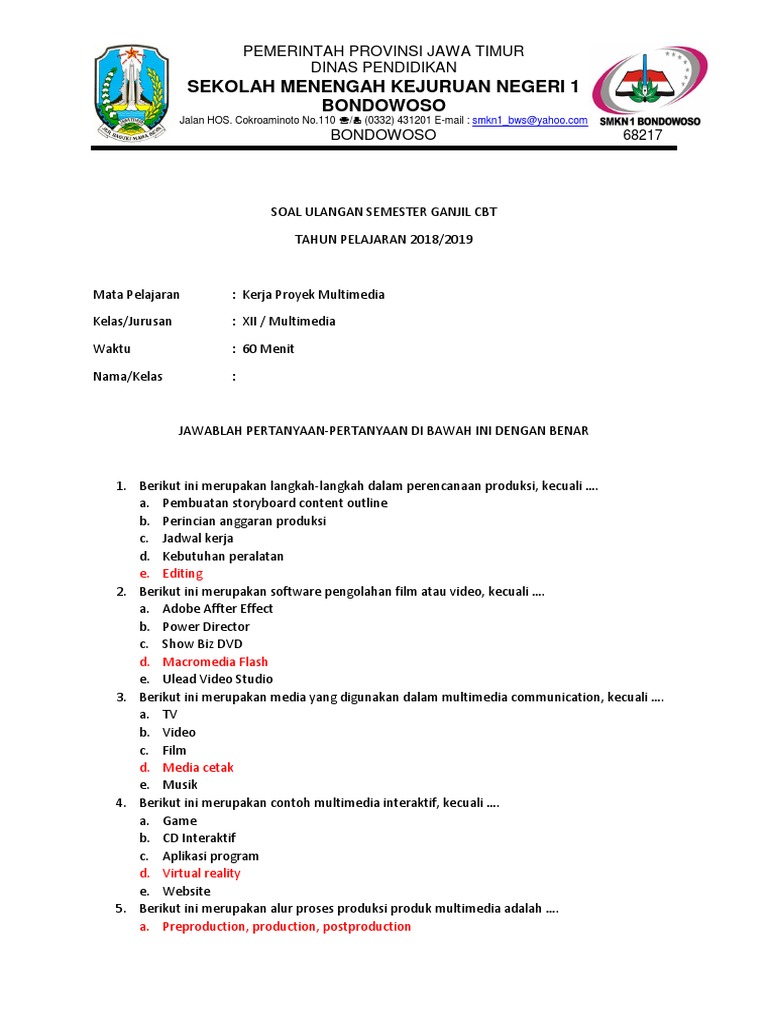 Jumlah soal sebanyak 50 butir soal pilihan ganda semuanya harus dijawab dan 5 Soal Uraian 6. SOAL LATIHAN MULTIMEDIA TEKNIK PENGOLAHAN VIDEO BESERTA JAWABANNYA. Proposal Iklan layanan Masyarakat.